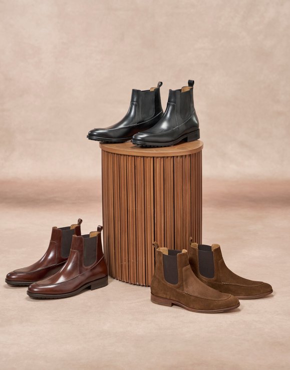 L'Homme Pressé is without doubt the perfect, trendy Chelsea boot, with a balanced line, slightly rounded at the ends to better adapt to any wardrobe. In fashion since the 1960s, this historically London-style laceless riding boot is now a classic city boot and the perfect pair of men's shoes to match any outfit. Traditionally designed in smooth black leather, over time it has evolved into a small round-toed boot suitable for all seasons and trends. Timeless, this pair of luxury ankle boots will accompany you over time. One of its secrets: this elegant leather boot benefits from top-of-the-range finishes such as its discreet side elastic band, its small heel sole in wood-effect leather or its double ornamental stitching to enhance the aesthetics of its line. Easy to slip on and comfortable, it is also men's boot par excellence, pleasant to mix with any wardrobe and the preferred solution for the casual man. In suede calf or smooth leather and without embellishments, our luxury men's boots can be worn with jeans for a rock look, or in a dressier version with a city outfit or a suit, for which we prefer the chelsea boot in black or brown leather. This shoe is available as a flat boot for the city or as a men's boot with a sporty tone and a commando sole with a notched sole. Our luxury Chelsea boots are available in several materials and colours adapted to all seasons, such as chocolate and black for autumn-winter, but also in havana, navy blue or light grey for the mid-season. The materials are carefully selected and come in beautiful textures: from smooth or grained leather to nubuck and velvet leather. Its small 2.5 cm heel and its solid counter give this luxury men's boot great comfort, while its insole and thick cowhide lining ensure undeniable ease of walking. One of its secrets: the gentleman's corner under the leather sole, discreet and practical. Discover our tips for taking care of your suede boots with our guide in which we give you all the right gestures to best maintain your pair of men's chelsea boots with our top-of-the-range care line.